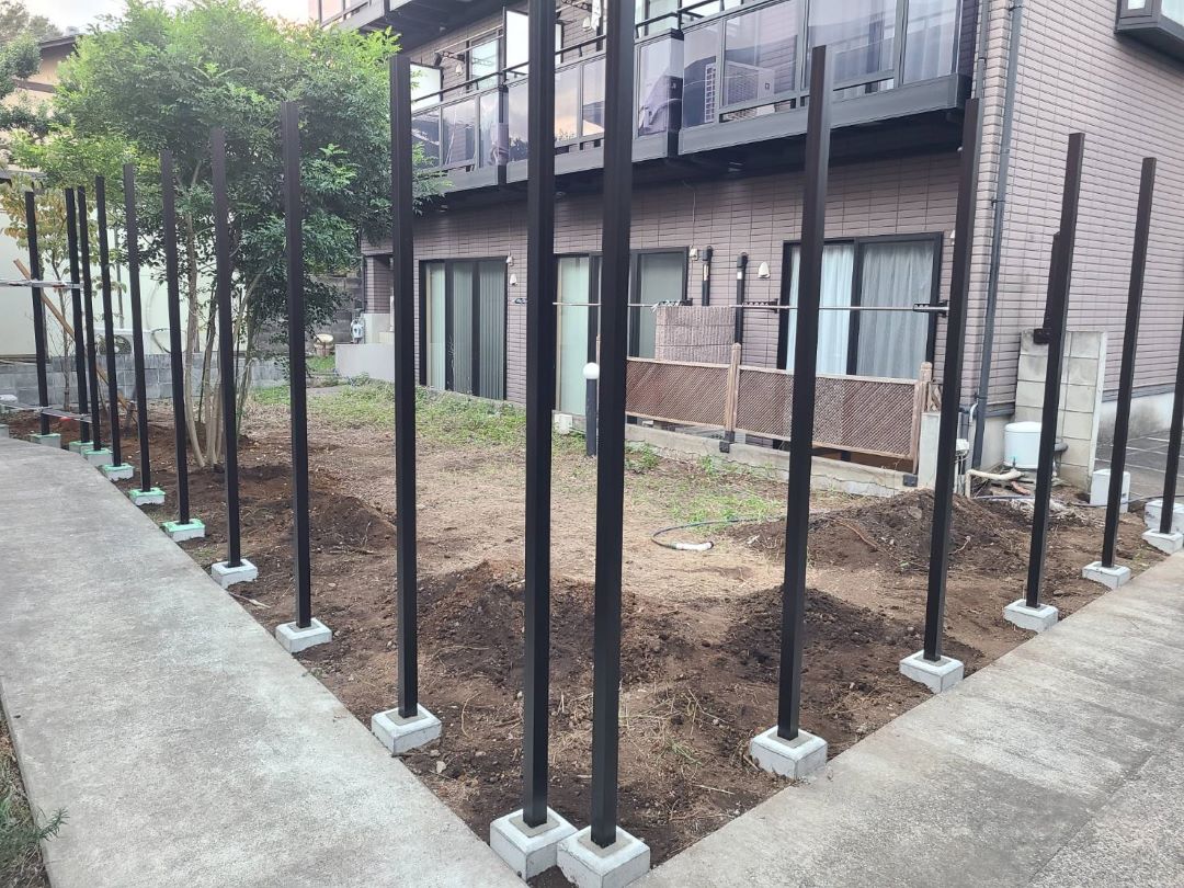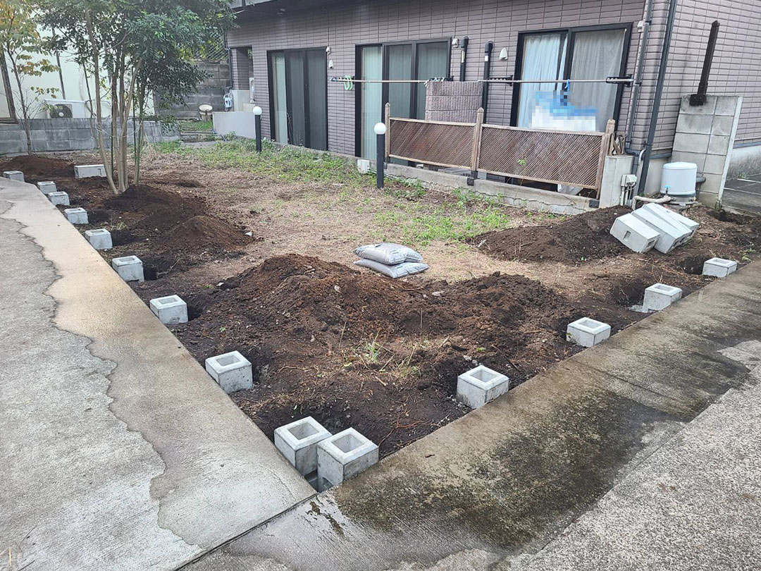 スッキリしたお庭にフェンスの独立基礎(柱を支えるための基礎)を設置していきます。
